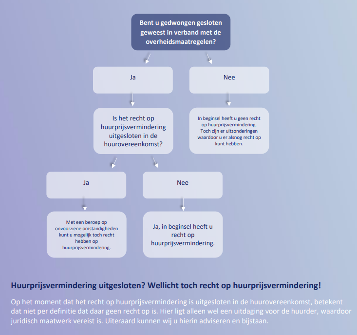 Sinds de gedwongen sluiting van de horecabedrijven, heeft ons kantoor veel vragen ontvangen vanuit huurders of dat zij recht hebben op een huurprijsvermindering. Benieuwd of u ook recht heeft op huurprijsvermindering? Check het in onderstaand schema.